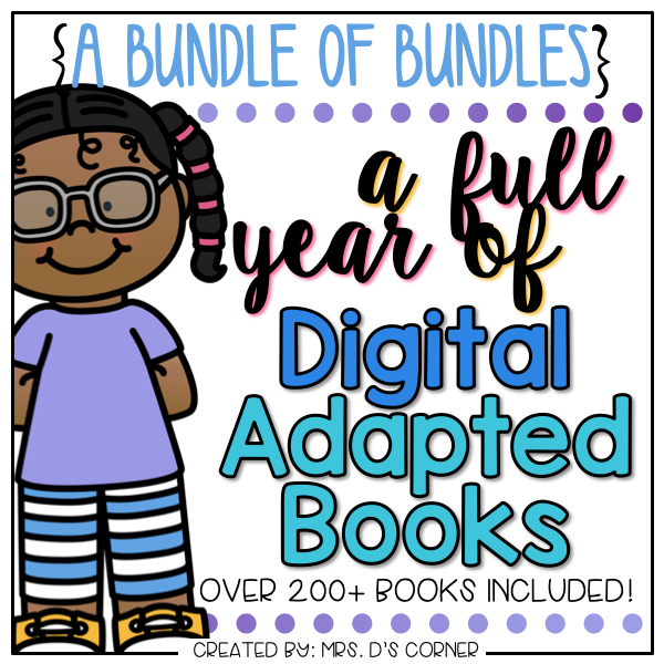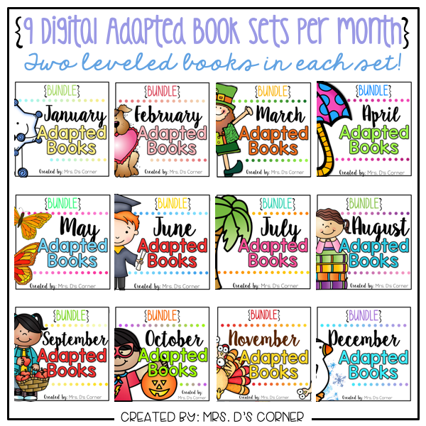 This bundle includes every monthly adapted book bundle available in my TPT store in digital adapted book format. You can find individual monthly bundles and other adapted book bundles here: Adapted Book Bundles.