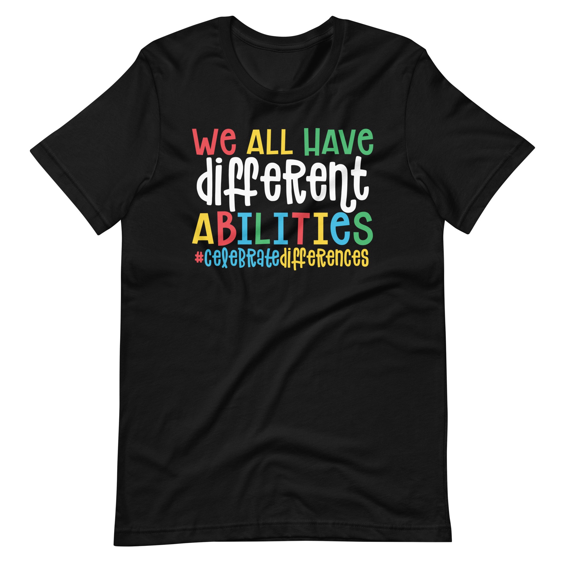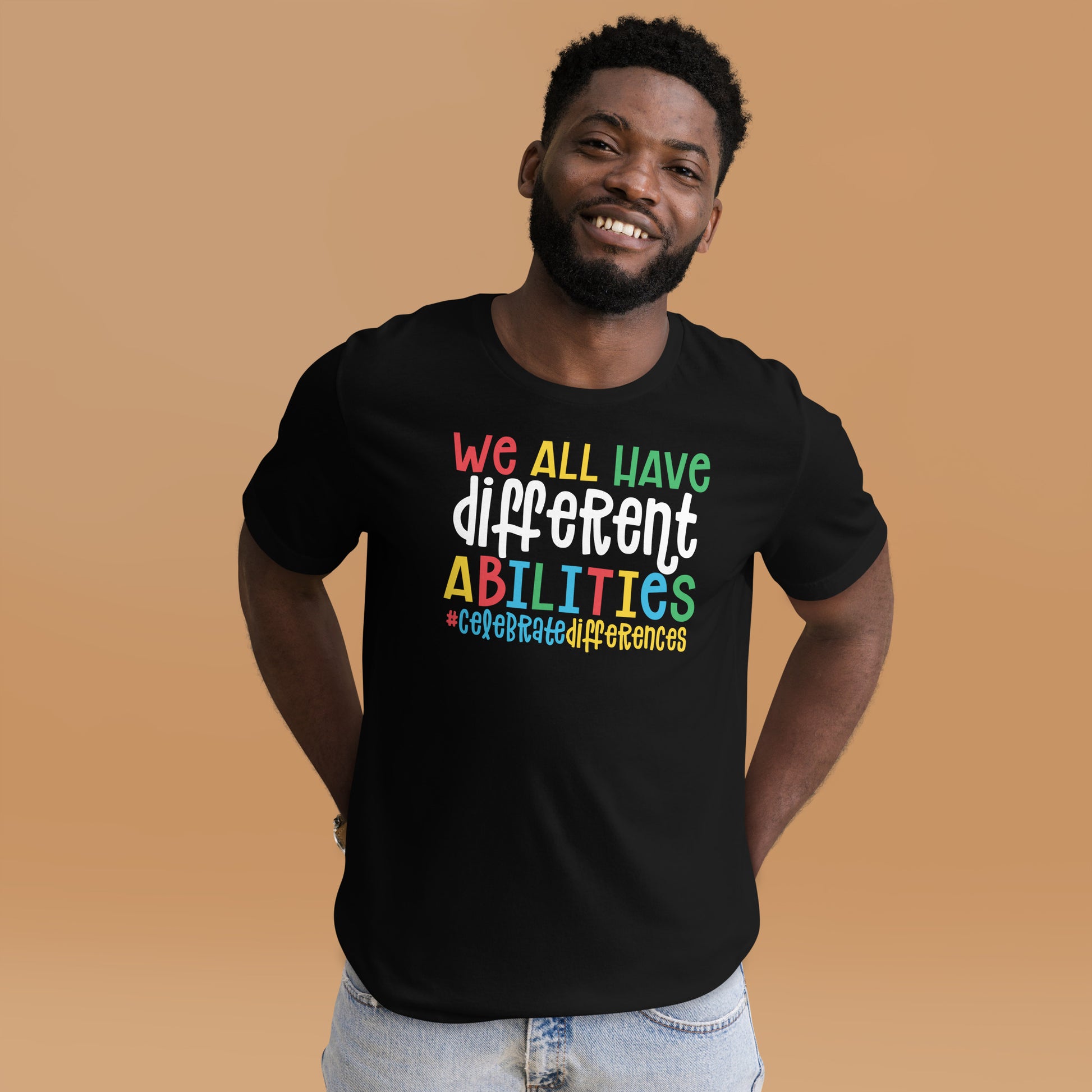 We all have different abilities, celebrate differences teacher tee in the stylish and comfortable Bella + Canvas brand.