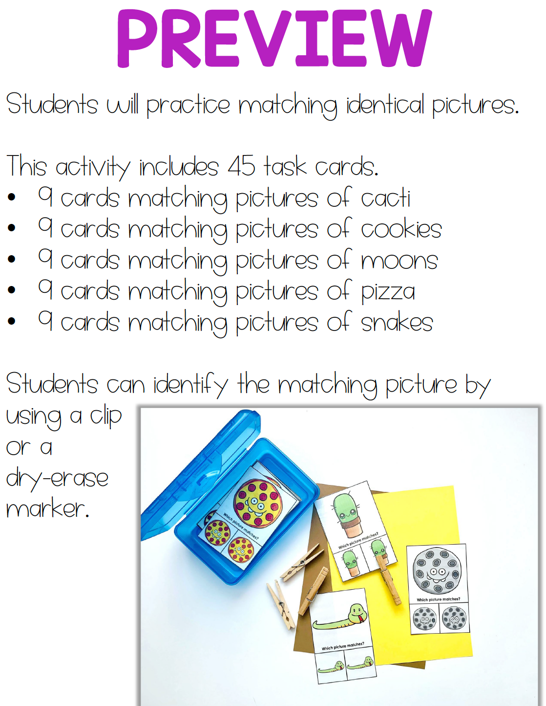 Matching identical pictures - 45 task cards - clip or circle matching picture (two options)