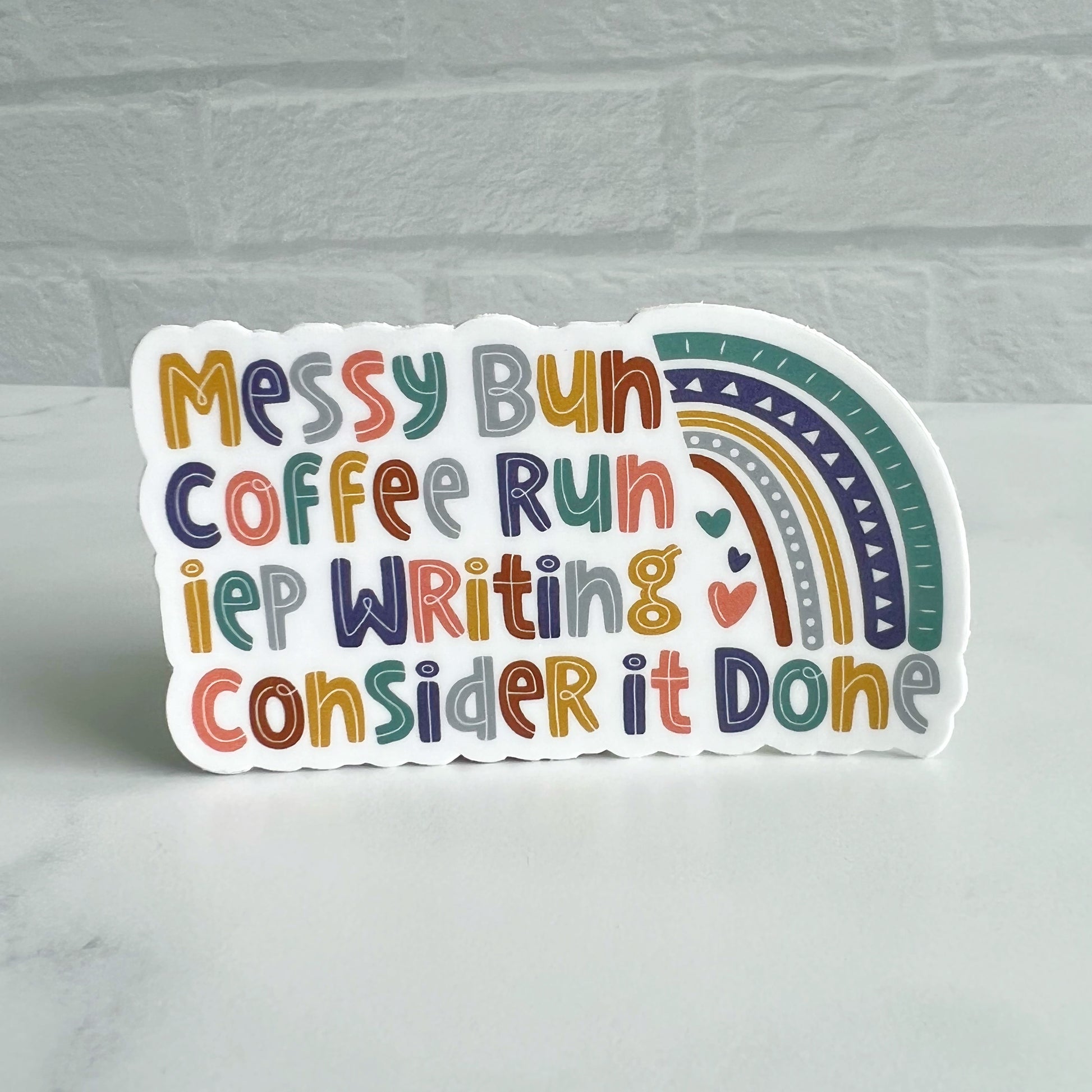 • 1 (one) Messy Bun Coffee Run IEP Writing Getting It Done sticker