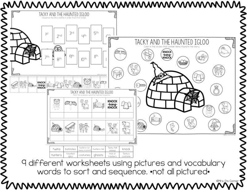 A book companion with 4 different activities to practice sequencing, reading comprehension, writing, and more with Tacky and the Haunted Igloo