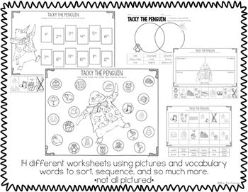 A book companion with 4 different activities to practice sequencing, reading comprehension, writing, and more with Tacky the Penguin.