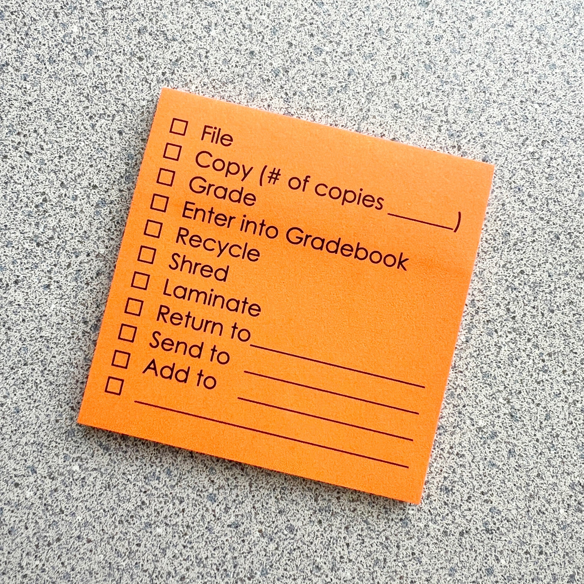 Use this teacher check-off sticky note to remember what you need to do with a stack of papers or individual papers. Keep it all organized!